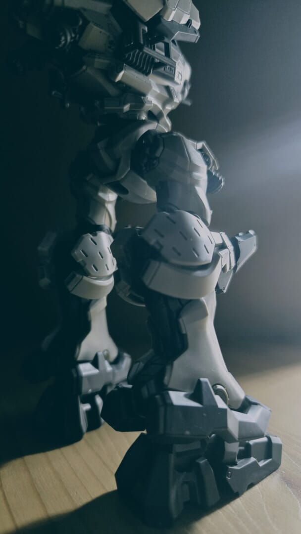 脚部もガンダムとは異なるデザインで、カッコイイですね!特に膝周りの造形や、ゴツいソールが良いですね!キレイな曲線でデザインされたパイプ状のパーツが、背面でパツンと切れているパターンが、アーマードコアらしさである気がします!