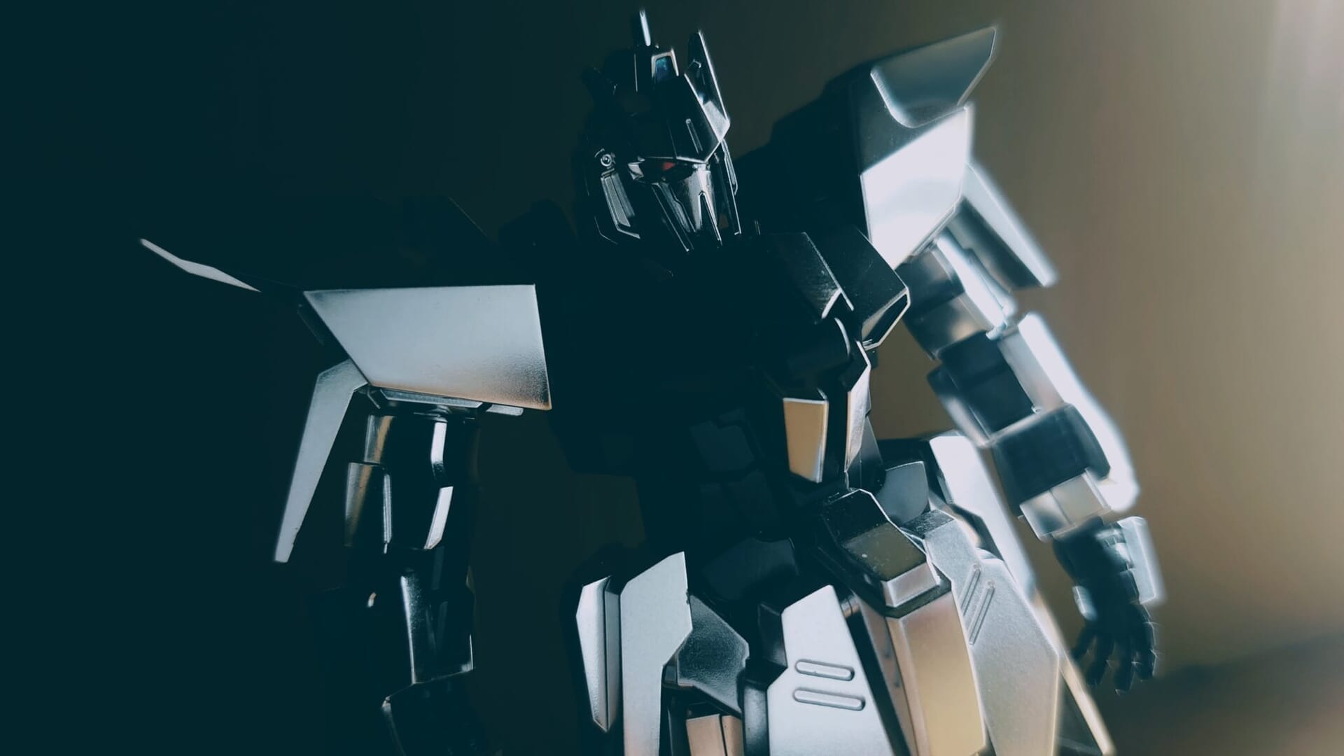 デルタ系列MSは初めて組みましたが、ヒザ下から足先に伸びるパーツがカッコイイですね!全体的に直線が際立つデザインで、「シルバーグレーコーティング」がシャープに映えます!