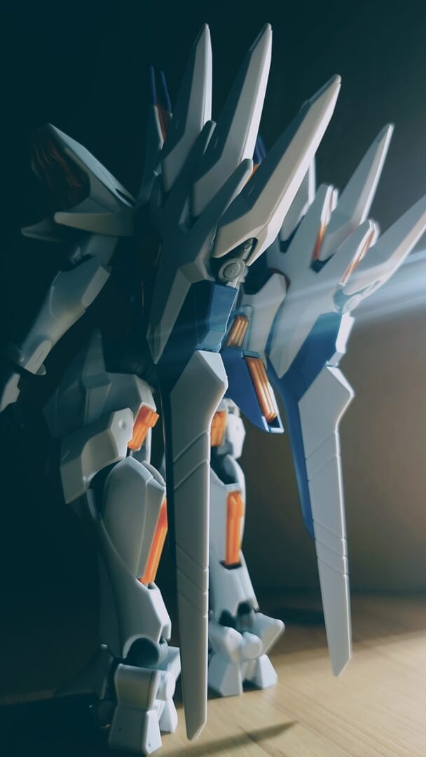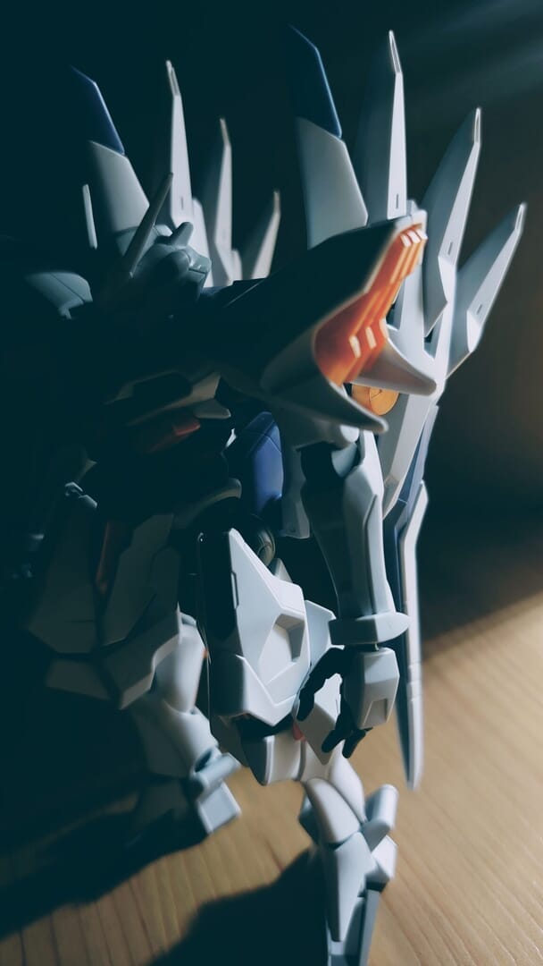 F91のV.S.B.R.(ヴェスバー)のような「ヴァジュラ」を組みました!肩部装甲だけでもインパクトがありましたが、より派手なシルエットになりました!トゲ部分は「リンコウ」と呼ばれるガンビットであり、外すことも可能です!色と形から「ヴァイスリッター」を連想しますねw