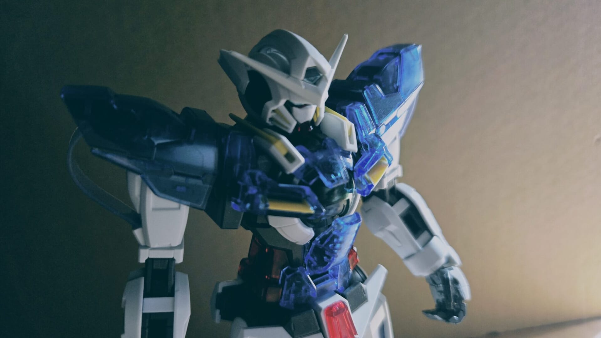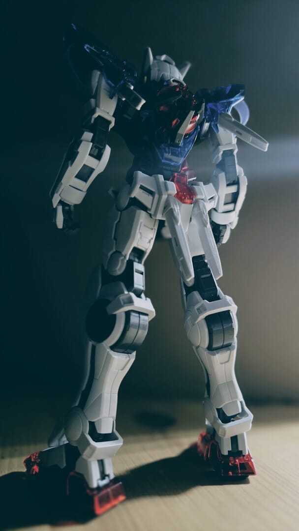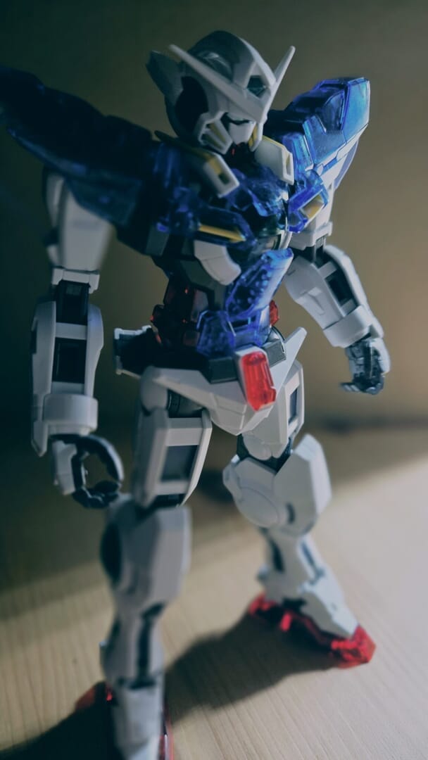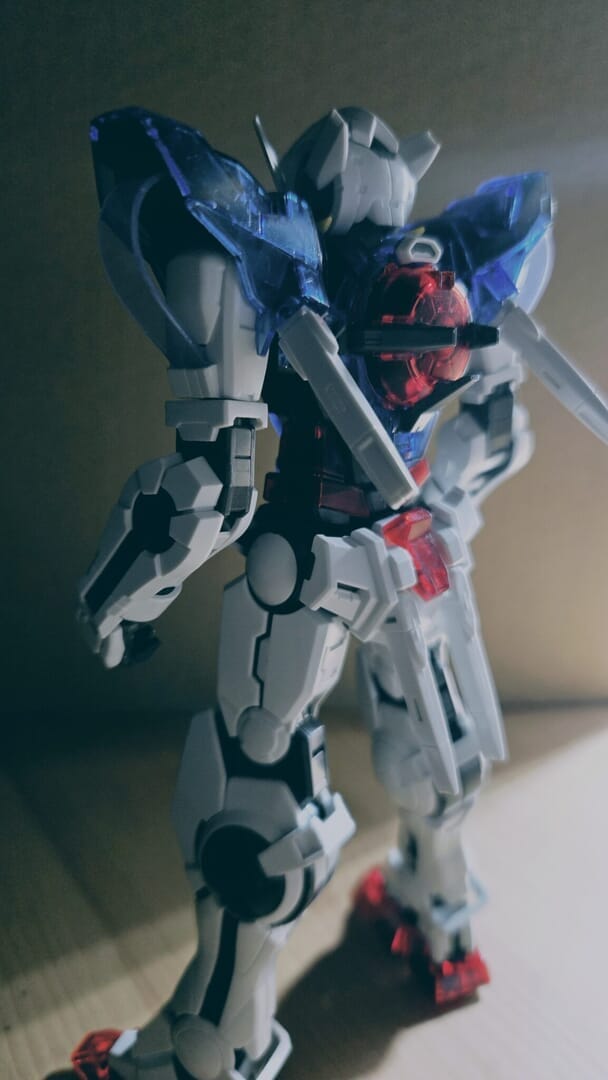 白色パーツが多いアストレアとは違い、エクシアは青色パーツが多いデザインでした!内部フレームのグレー色が透けるため、クリアブルーが落ち着いた色合いになるので渋い印象になりました!特にアストレアは、バックパックも特徴的です!
