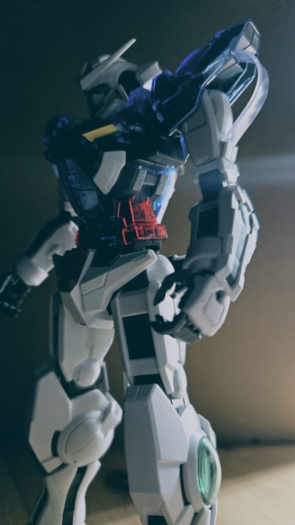 上半身に青色の面積が増えて、エクシアらしさが増しました!サーベルがリアスカートに付いていることに驚きましたが、肩部の後ろにも付いているのは斬新ですねw アーチ状のフォログラムコードシートが目立って、近未来感があります!