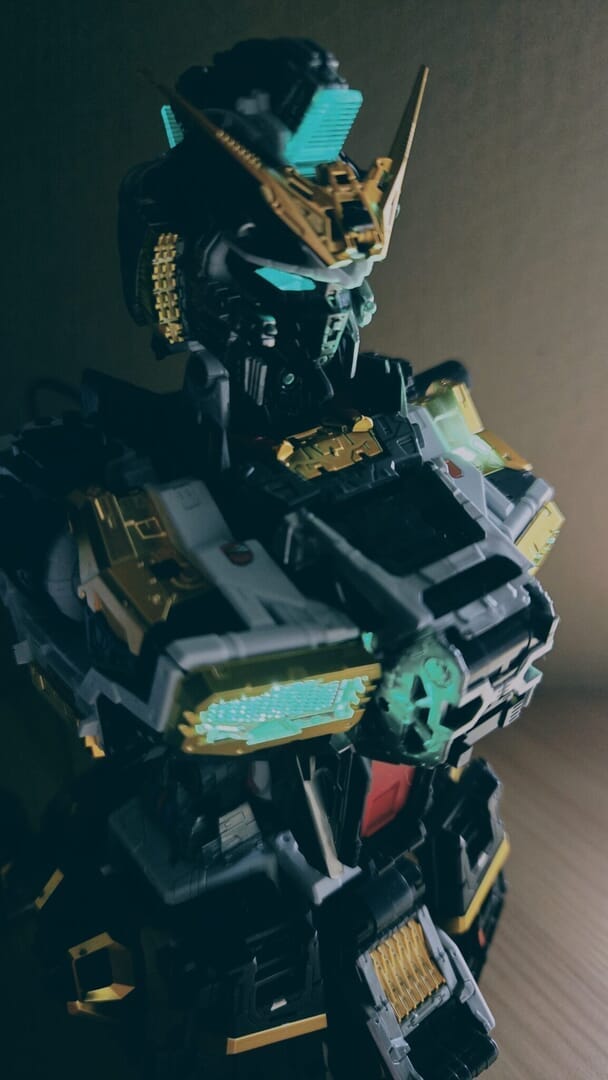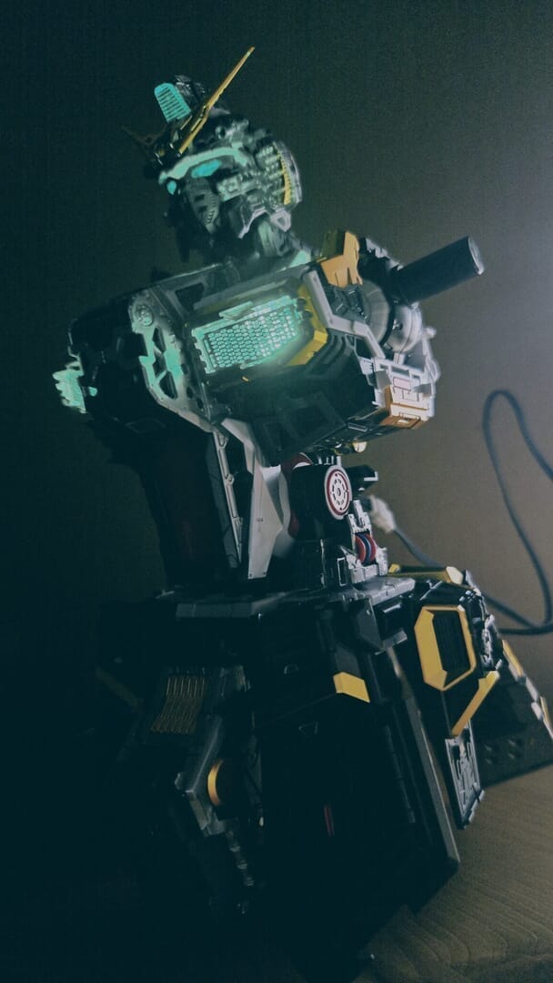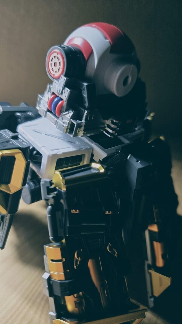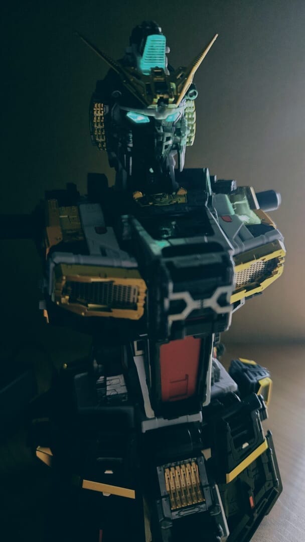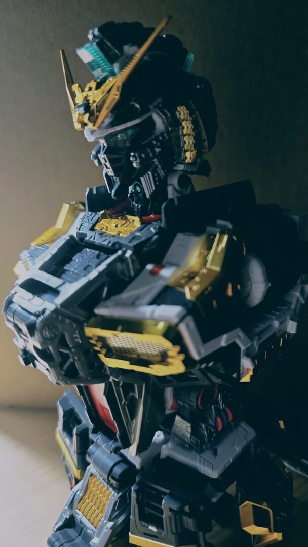 LEDユニットを組み込み、ついに点灯!カッコイイ!実はカメラアイや額センサーの光は、首に仕込んだLEDから光を引っ張ってきています!クリアパーツの使い方が上手ですね!
