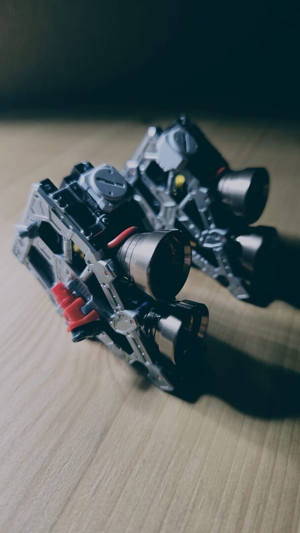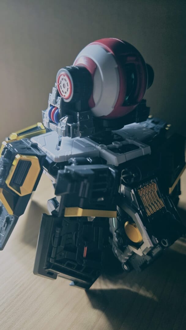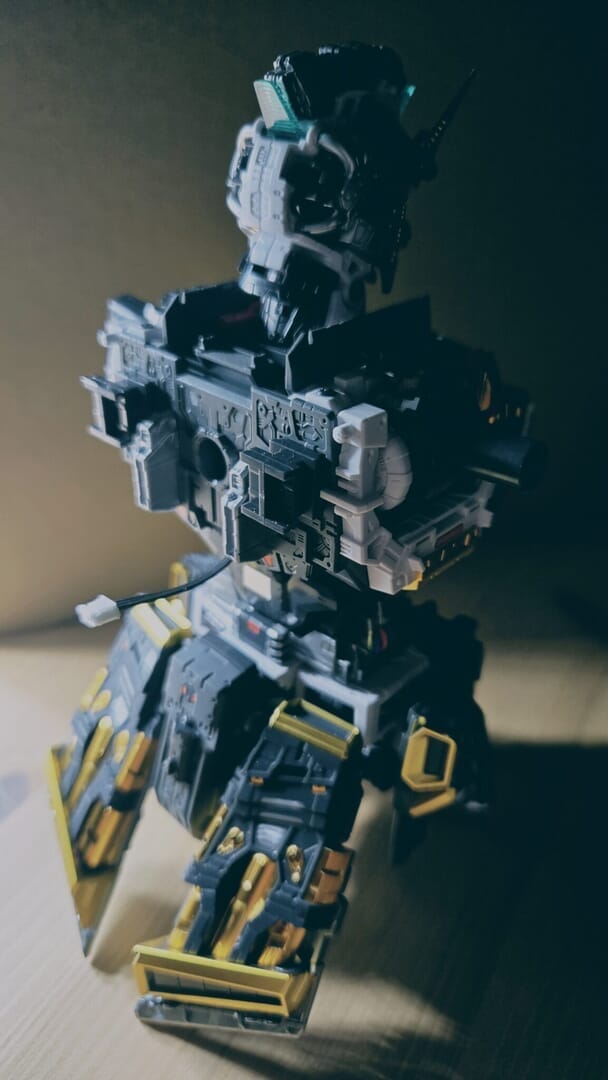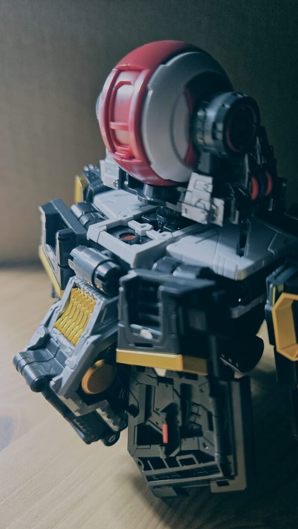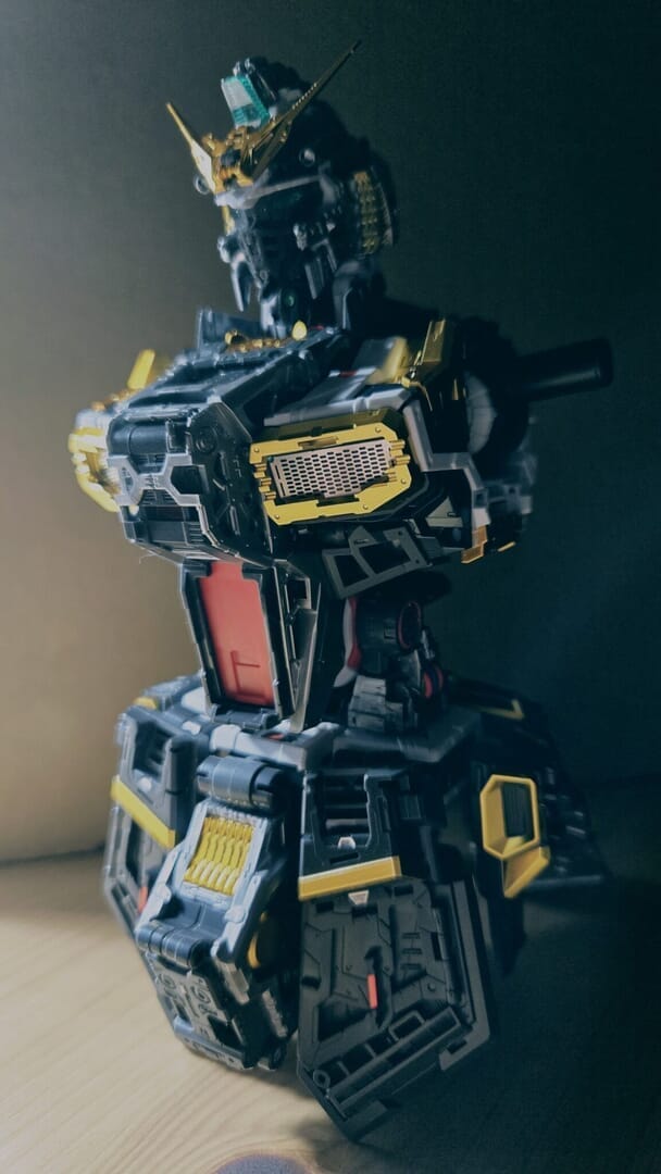 LEDユニットを組み込み、ついに点灯!カッコイイ!実はカメラアイや額センサーの光は、首に仕込んだLEDから光を引っ張ってきています!クリアパーツの使い方が上手ですね!